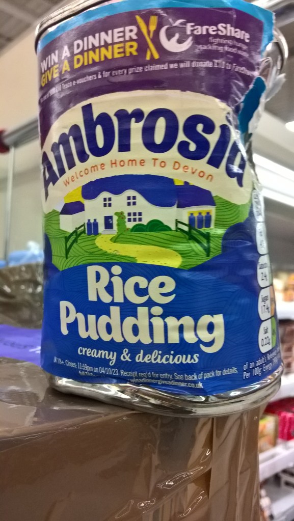One can of Ambrosia cream rice is displayed priced at £2.30 reduced from £3.62 although the price on Tesco.com is £1.50. Clearly this is being sold for a profit while customers are encouraged to donate their purchased items to collections for food banks.